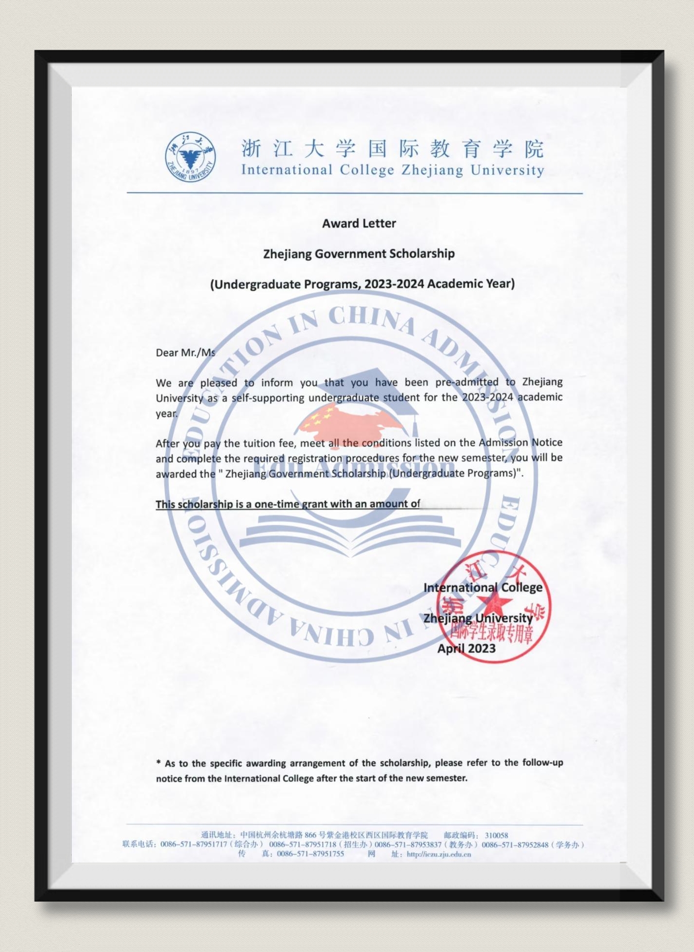 Zhejiang government Scholarship (Free tuition fee, free accomodation fee, free insurance, Monthly stipend)